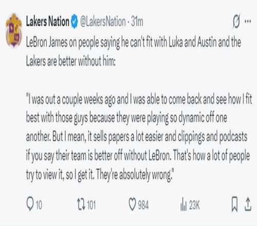 詹姆斯還回懟了那些說(shuō)沒(méi)有他湖人會(huì)更好的言論!他表示:我們?nèi)说膯?wèn)題一直是時(shí)間問(wèn)題,上賽季盧卡剛好我們?cè)谀ズ?,本賽季開(kāi)局我、里夫斯都缺席了一些比賽,我們都在適應(yīng)彼此,我回歸后思考了怎么融入他們。外界喜歡制造話題是為了推銷(xiāo)他們的報(bào)紙、播客,這些都是博眼球的方式我也能理解,但他們是完全錯(cuò)誤的。