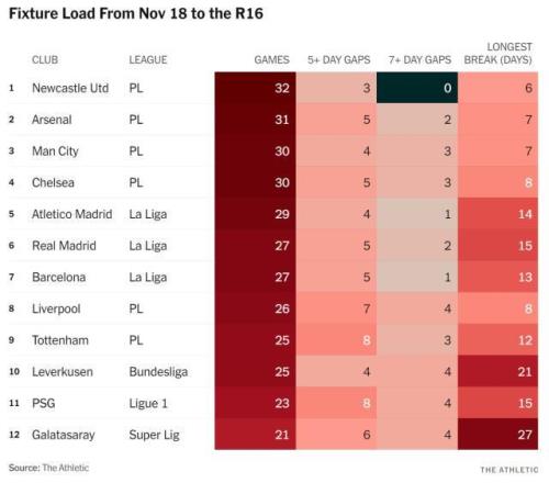 英超球隊(duì)沒(méi)有冬休,比賽數(shù)量更多,是事實(shí)。競(jìng)技網(wǎng)一周前的數(shù)據(jù)顯示,本季五大聯(lián)賽,比賽數(shù)量前4名,被紐卡斯?fàn)柭?lián)、阿森納、曼城、切爾西這4支英超球隊(duì)包攬。本周一組新數(shù)據(jù),則揭示了從11月國(guó)際比賽周到歐冠16強(qiáng)之間的更鮮明對(duì)比。上述英超4隊(duì)最多打了32場(chǎng)比賽,皇薩則只有27場(chǎng)。
