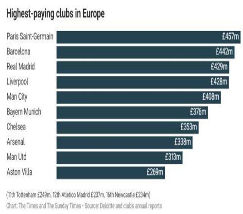 英超整體經(jīng)濟(jì)體量舉世第一,轉(zhuǎn)會(huì)總開(kāi)銷也往往抵上其他四大聯(lián)賽之和,這都是事實(shí)。但必須指出,在最頂尖豪門(mén)的領(lǐng)域,英超不僅競(jìng)技實(shí)力對(duì)比“皇薩仁黎”往往處于下風(fēng),就比錢(qián),英超豪門(mén)經(jīng)常也是相對(duì)“貧窮”的那個(gè)。