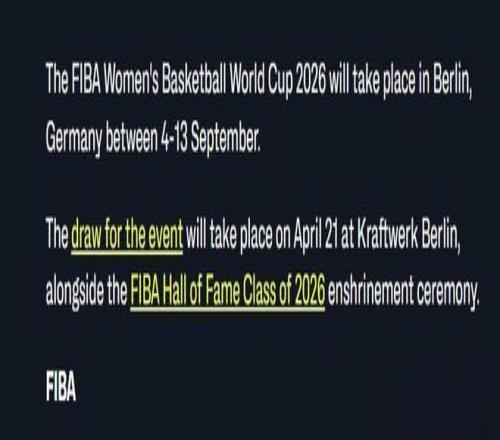 宣布2026年女籃世界杯正賽將于9月4日至13日在德國柏林開始。
