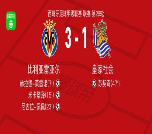 北京時間3月21日西班牙足球甲級聯(lián)賽 聯(lián)賽 第29輪,比利亞雷亞爾主場對陣皇家社會。比利亞雷亞爾赫拉德-莫雷諾破門,米卡塔澤破門,尼古拉-佩佩破門?;始疑鐣K契奇破門。最終比分比利亞雷亞爾 3-1 皇家社會。