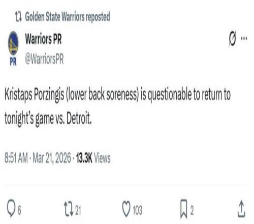 勇士隊(duì)巴特勒?qǐng)?bào)銷,庫(kù)里、塞斯庫(kù)里、波斯特、穆迪、霍福德悉數(shù)因傷缺席,同時(shí)波神在出戰(zhàn)半場(chǎng)后傷退,勇士官方給出的原因是下背部酸痛。