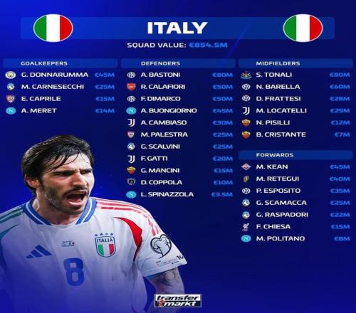 意大利國家隊新一期大名單德轉(zhuǎn)身價榜: