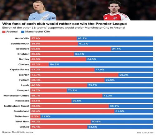 支持阿森納奪冠比例最大的是埃弗頓,達到71.7%,阿森納主帥阿爾特塔球員時期曾是埃弗頓的功勛球員。支持曼城比例最大的自然是阿森納的北倫敦死敵熱刺,多達91.8%的熱刺球迷希望曼城奪冠。西漢姆聯(lián)球迷最為均衡,投票接近五五開。