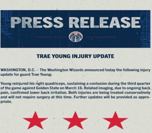 當?shù)貢r間3月21日,奇才官方公布了特雷-楊的傷情,他在3月16日對陣勇士的比賽中傷退,經(jīng)檢查他的右股四頭肌挫傷,同時伴有下背部刺激,將無限期缺戰(zhàn)。