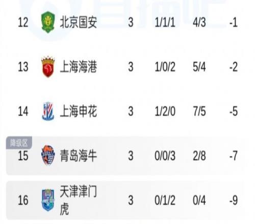 在所有球隊當中,最讓人失望的無疑是青島海牛和天津津門虎,兩支球隊在3輪比賽之后均未嘗勝利,分別排名倒數(shù)第1和第2的位置,成為了降級的熱門球隊。天津津門虎本賽季的賽程還是非常不錯的,前3輪比賽對陣的有兩支球隊都是升班馬球隊,深圳新鵬城的成績也比較一般,但是他們依然難求一勝,如今積分還是負9分,壓力還是非常大的。