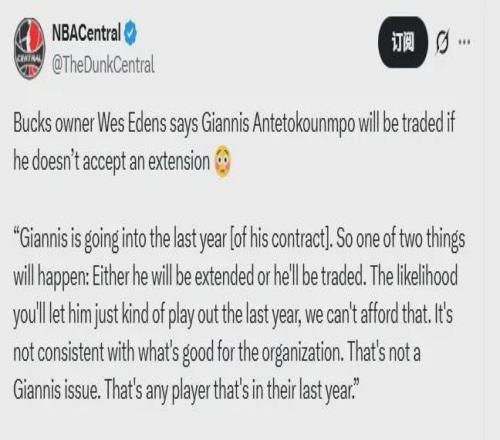 雄鹿老板韋斯-埃登斯接受ESPN采訪時(shí),明確表示下賽季為字母哥的準(zhǔn)合同年(27-28賽季擁有球員選項(xiàng)),球隊(duì)不可能承擔(dān)如此風(fēng)險(xiǎn)。