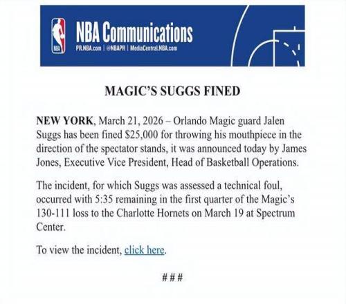 NBA官方還表示,魔術(shù)隊(duì)后衛(wèi)薩格斯因朝著觀眾席扔牙套被罰款25000美元。