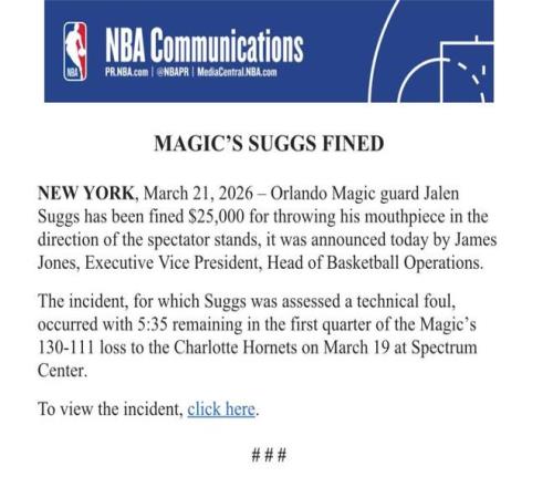 在3月20日魔術(shù)對(duì)陣黃蜂的比賽第一節(jié)中,魔術(shù)球員薩格斯將牙套扔向了觀眾席,他因此也被罰款25000美元。