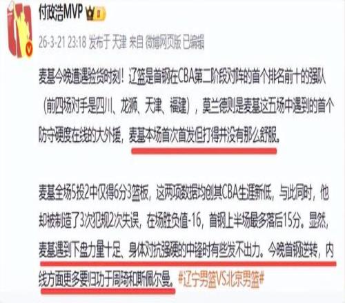 下半場許利民基本棄用了麥基,特別是第四節(jié)完全不用他,主打另一位大外援斯佩爾曼,全場比賽麥基僅6分3板,在場輸16分。而遼寧隊的莫蘭德全場砍下9分和11個籃板,他真的是完爆麥基。媒體人付政浩也不認可麥基,他說“莫蘭德是麥基這五場中遇到的首個防守硬度在線的大外援,麥基本場首次首發(fā)但打得并沒有那么舒服?!备墩?還指出,“麥基遇到下盤力量十足、身體對抗強硬的中鋒時有些發(fā)不出力。今晚首鋼逆轉,內(nèi)線方面更多要歸功于周琦和斯佩爾曼?!?/p>