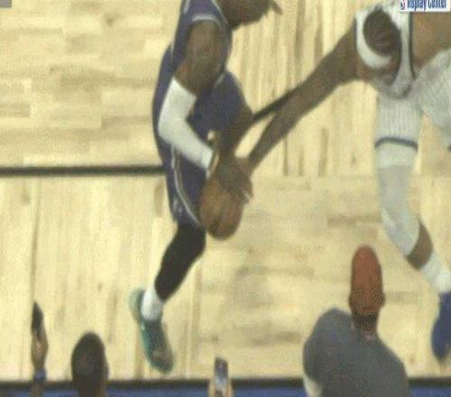 不過慢鏡頭顯示他的左手打到了詹姆斯的手臂,裁判未作表示。