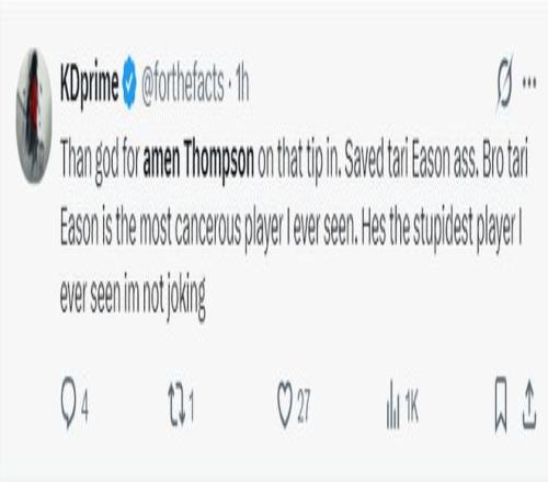 杜蘭特球迷:感謝GOD讓阿門補(bǔ)救了這一切,他救了伊森的命。伙計(jì)們,伊森是我見過最危險(xiǎn)的球員也是最愚蠢的,我不是在開玩笑。