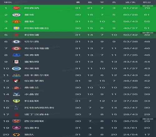 北京時間3月22日,英超第31輪在昨天到今天凌晨又結(jié)束了5場對決,我們看看最新積分榜變動,主要的信息是:利物浦1-2不敵布萊頓,切爾西0-3慘敗埃弗頓,富勒姆3-1伯恩利,利茲聯(lián)0-0布倫特福德,曼聯(lián)2-2伯恩茅斯!
