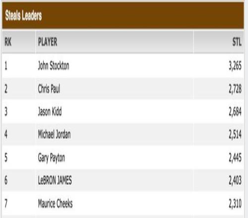 搶斷:斯托克頓的紀(jì)錄(3265次)遙不可及,保羅的第二名(2728次)和基德的第三名(2684次)也不太可能被超越。但目前排名第六的詹姆斯(2403次)下賽季有機(jī)會(huì)追上排名第五的加里·佩頓(2445次)和排名第四的邁克爾·喬丹(2514次)。