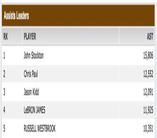 助攻:詹姆斯在歷史助攻榜上排名第四(11925次),大概率追不上紀(jì)錄保持者約翰·斯托克頓(15806次),但他有可能在下賽季初追上杰森·基德(12091次),并在下賽季末追上克里斯·保羅(12552次)。