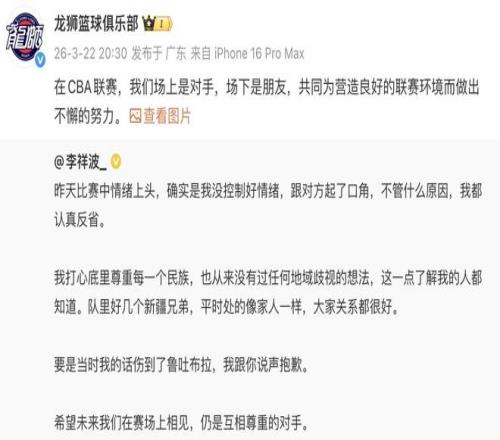 昨晚的CBA常規(guī)賽,寧波在主場(chǎng)以83-95不敵廣州。寧波町渥男籃主場(chǎng)不敵廣州龍獅,賽后握手環(huán)節(jié),廣州球員李祥波與新疆籍球員魯吐布拉發(fā)生沖突。事后,魯吐布拉和廣州龍獅俱樂(lè)部均發(fā)文進(jìn)行回應(yīng)。