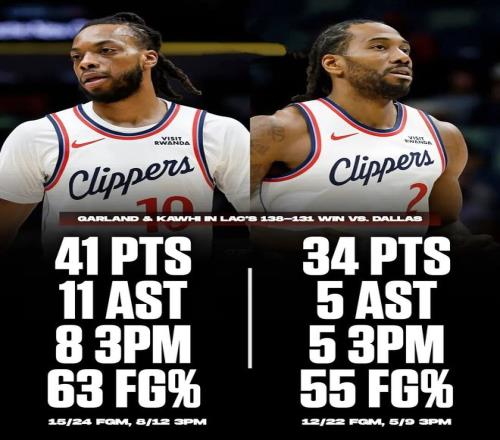 數(shù)據(jù)上看,倫納德可能不是這場比賽快船最耀眼的——隊友加蘭全場拿到了41分3籃板11助攻,得分、助攻均為全隊最高。
