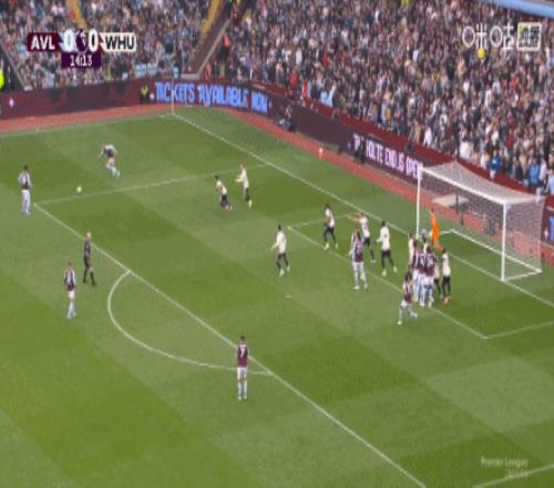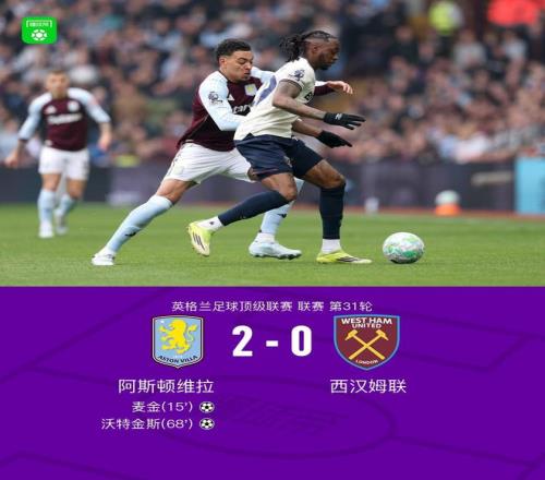 第68分鐘,羅杰斯射門被撲,沃特金斯補射破門,維拉2-0西漢姆聯(lián)