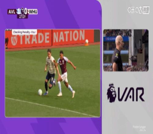 第27分鐘,沃特金斯禁區(qū)倒地,裁判觀看VAR后取消點球判罰