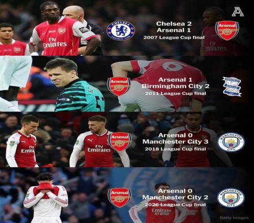 在剛剛結(jié)束的英聯(lián)杯決賽中,阿森納0-2完敗曼城。至此,阿森納遭遇了英聯(lián)杯決賽4連敗,再次無緣此項(xiàng)賽事冠軍。