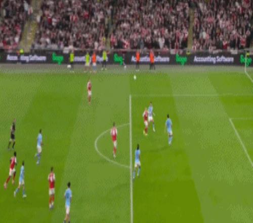 開場(chǎng)僅7分鐘,薩卡右路突破橫傳,蘇維門迪跟上直塞,哈弗茨單刀推射,被特拉福德神勇封堵,隨后薩卡連著兩腳補(bǔ)射,依然沒能打穿曼城門將的十指關(guān)。