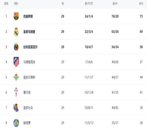 在積分榜上,巴薩依然占據(jù)榜首位置,拿到73分?;蜀R險(xiǎn)勝之后緊隨其后,拿到69分,依然是落后4分。冠軍的爭奪非常激烈。比利亞雷亞爾以58分排名第3。馬競輸球,依然是57分,排名第4?;始邑惖偎挂?4分排名第5。塞爾塔拿到41分,排名第6。