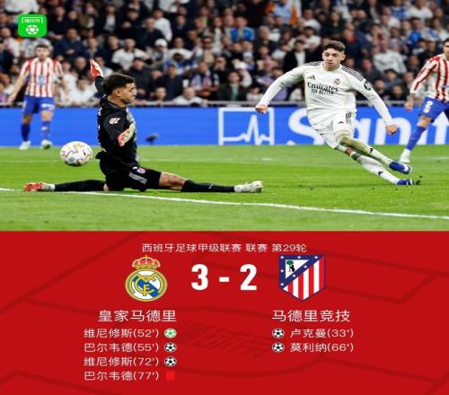 北京時間3月23日西班牙足球甲級聯(lián)賽 聯(lián)賽 第29輪,皇家馬德里主場對陣馬德里競技?;始荫R德里維尼修斯梅開二度,巴爾韋德破門。馬德里競技盧克曼破門,莫利納破門。最終比分皇馬 3-2 馬競。