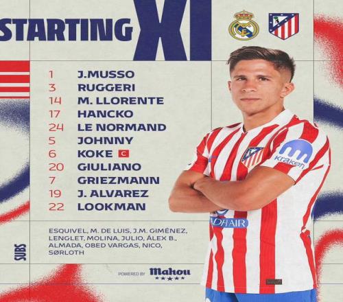 馬競(jìng)同樣是標(biāo)準(zhǔn)的442,門將穆索。后防線:魯杰里、馬科斯·略倫特打兩個(gè)邊后衛(wèi),漢茨科、勒諾爾芒組成雙中衛(wèi)。前場(chǎng):盧克曼、小西蒙尼打兩個(gè)邊前衛(wèi),隊(duì)長(zhǎng)科克和卡多佐組成雙后腰。前鋒是格列茲曼和阿爾瓦雷斯。