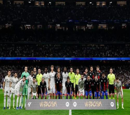 在伯納烏球場(chǎng)的馬德里德比開(kāi)始前,皇家馬德里和馬德里競(jìng)技的球員以及裁判團(tuán)隊(duì)與一幅標(biāo)語(yǔ)牌合影,以支持當(dāng)天開(kāi)展的反種族主義宣傳運(yùn)動(dòng)。