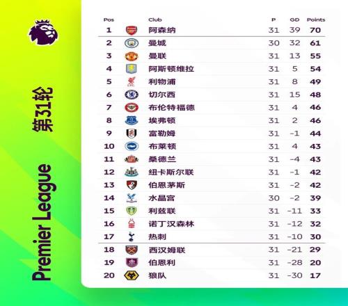 北京時(shí)間3月23日晚,本輪英超除曼城對陣水晶宮延期外,其他9場比賽全部結(jié)束。由于本周阿森納在聯(lián)賽杯決賽對陣曼城,雙方本輪聯(lián)賽改期進(jìn)行(阿森納比賽提前至2月19日,曼城比賽則推遲,具體時(shí)間待定)。在提前進(jìn)行的那場對決之中,狼隊(duì)爆冷2比2逼平領(lǐng)頭羊阿森納,如今槍手多賽一場情況下仍領(lǐng)先曼城9分;本周開打的8場英超31輪比賽中,曼聯(lián)2比2被伯恩茅斯逼平仍位列第三;而阿斯頓維拉2比0輕取保級球隊(duì)西漢姆聯(lián),離曼聯(lián)僅剩1分;利物浦則是1比2負(fù)于布萊頓繼續(xù)位居第五,切爾西0比3慘敗埃弗頓,紅藍(lán)兩軍雙雙折戟。