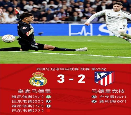 北京時間3月23日4:00,西甲第29輪上演馬德里德比,皇家馬德里坐鎮(zhèn)伯納烏球場迎戰(zhàn)馬德里競技,主裁判何塞-穆努埃拉執(zhí)法本場比賽。上半場,朱利亞諾-西蒙尼腳后跟助攻盧克曼首開紀(jì)錄。下半場風(fēng)云突變,維尼修斯點射扳平,巴爾韋德外腳背破門反超,莫利納世界波再度扳平,隨后維尼修斯內(nèi)切兜射梅開二度,巴爾韋德終場前被直紅罰下。最終,皇馬3比2逆轉(zhuǎn)馬競,拿下德比勝利。