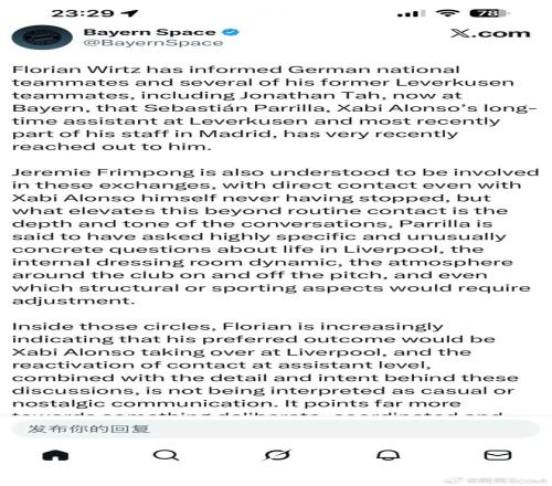 Florian Wirtz 已向德國(guó)國(guó)家隊(duì)隊(duì)友以及部分前勒沃庫(kù)森隊(duì)友(包括現(xiàn)效力拜仁的 Jonathan Tah)透露,帕里利亞(Sebastián Parrilla)——這位長(zhǎng)期擔(dān)任 Xabi Alonso 助教、并在其最近于馬德里執(zhí)教期間繼續(xù)隨行的核心成員——在近期已主動(dòng)與他取得聯(lián)系。