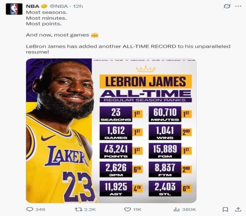 官方為41歲勒布朗戴上皇冠!又沖全新歷史第1紀(jì)錄湖媒轉(zhuǎn)推贊GOAT