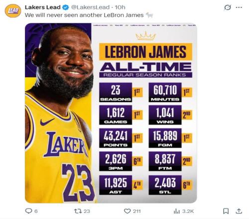 湖人媒體轉(zhuǎn)發(fā)NBA官方的海報(bào)后寫道:我們?cè)僖部床坏较乱粋€(gè)勒布朗了,GOAT。(這樣的勒布朗湖人管理層還不想續(xù)約嗎?)