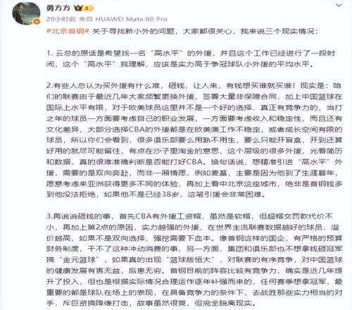 北京男籃尋找新小外援的事情是很多球迷關(guān)注的焦點,北京記者勇方方發(fā)文談到了這件事的相關(guān)情況。勇方方表示,北京男籃的確想要一名“高水平”的小外援,但操作起來的難度非常大,并不是砸錢就能解決的。而且北京男籃管理層也并不想搞“金元籃球”,這對CBA和中國籃球的發(fā)展都是有害無益、后患無窮。北京男籃這幾年的確逐步增大了投入,但也是根據(jù)實際情況合理運作逐年補強而來的。