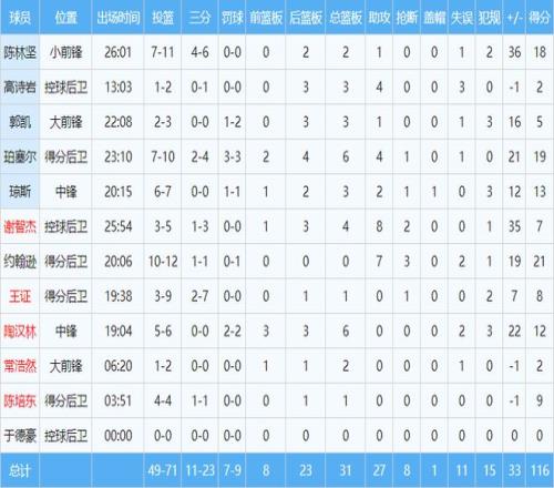 本場(chǎng)比賽,山東隊(duì)共有11名球員出場(chǎng),全部有得分進(jìn)賬,其中有5人得分上雙。約翰遜12投10中,高效砍下全場(chǎng)最高的21分和7助攻3搶斷。珀塞爾貢獻(xiàn)19分6籃板4助攻的全面數(shù)據(jù)。陳林堅(jiān)三分球6中4,得到18分。瓊斯13分,陶漢林12分6籃板。小將王證得到8分,常浩然2分2籃板。