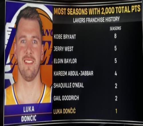 算上這場比賽的32分,東契奇賽季總得分2005分,是湖人隊史第七位單賽季得分突破2000分的球員。