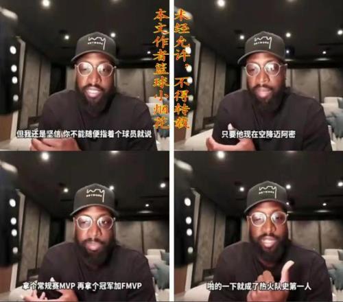 就比如說,你不能說一名球員在來到邁阿密之后,拿到了總冠軍和FMVP之后,啪的一下,他馬上就成為了熱火隊史最偉大的球員,是的,他是拿到了總冠軍,但我想說,總冠軍并不是他一個人的功勞,他有隊友,有教練,有管理層,有球迷以及眾多的工作人員在背后支持他,我是想說,總冠軍是一個團隊集體的功勞和榮譽,并不是個人用來去比拼誰的歷史地位更高的工具。