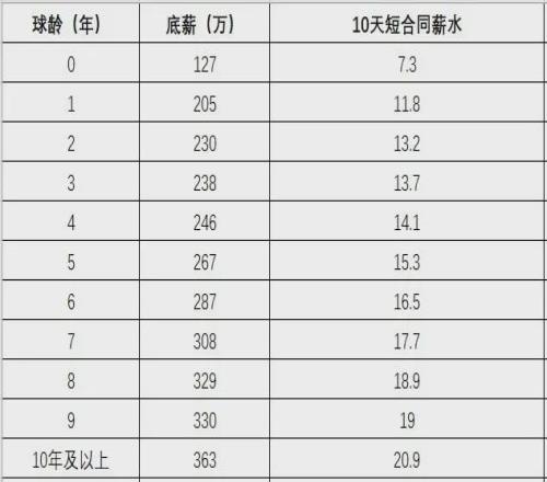 NBA一個(gè)完整的賽季是174天,10天合同薪水用NBA底薪除以174,再乘以10就能算出來。由于NBA球員效力年限不同,底薪合同金額不一樣,10天合同自然也不一樣。以富爾茨為例,他在NBA打了8年,10天合同是18.9萬美元。