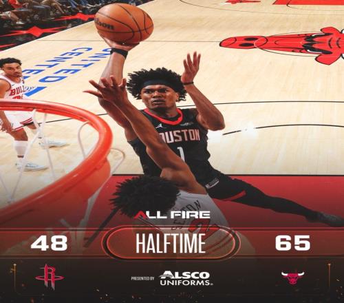 第二節(jié)開始后兩隊(duì)你來我往,申京找到手感連進(jìn)三球,火箭隊(duì)追至34-48。公牛隊(duì)暫停后米勒回應(yīng)三分,塞克斯頓也命中三分,一輪8-0的小高潮讓他們領(lǐng)先22分。杜蘭特和謝潑德各中三分試圖追分,迪林哈姆不甘示弱回敬5分,半場前3分鐘時公牛隊(duì)以63-42領(lǐng)先21分?;鸺?duì)暫停后罰中三球止血,瓊斯跳投命中,湯普森連拿3分,半場結(jié)束時火箭隊(duì)以48-65落后。