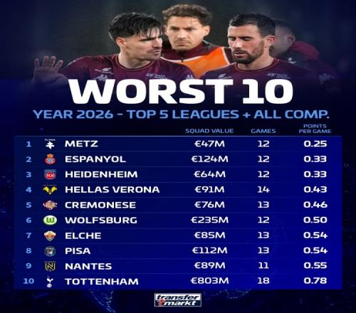根據(jù)德國轉(zhuǎn)會(huì)市場的統(tǒng)計(jì),2026年五大聯(lián)賽球隊(duì)的場均積分最低排名前十的球隊(duì)已經(jīng)浮出水面。其中,法甲球隊(duì)梅斯表現(xiàn)最為不佳,平均積分僅為0.25分。