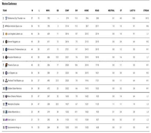 詳細(xì)的排名情況:1-3:雷霆、馬刺、湖人;(前二鎖定季后賽)