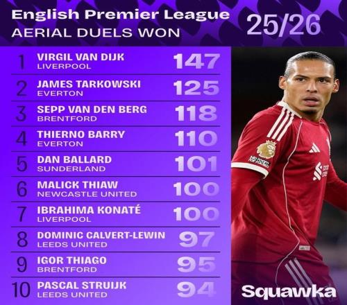北京時(shí)間3月24日,知名數(shù)據(jù)機(jī)構(gòu)Squawka統(tǒng)計(jì)出了本賽季至今英超成功爭(zhēng)頂次數(shù)最多的10名球員,范戴克147次斷檔領(lǐng)先,塔爾科夫斯基125次第2,馬利克-佳夫和科納特上榜。