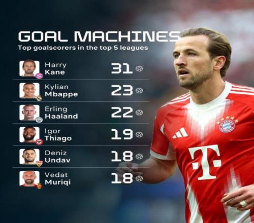 歐洲金靴最新排名:凱恩斷層領跑!姆巴佩哈蘭德苦笑,兩黑馬誕生