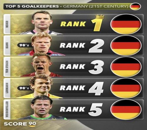 最近Score90發(fā)布了德國21世紀(jì)門將前五排名。諾伊爾坐上第一的位置,后面的卡恩、特爾施特根、萊曼和魏登費(fèi)勒也都在列。第一名看起來懸念不大,真正容易讓人多看兩眼的,還是后面幾個(gè)人的先后順序。尤其是第二到第四這幾個(gè)位置,這樣排,真的都能服氣嗎?