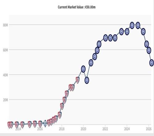 巴雷拉德轉(zhuǎn)身價經(jīng)歷四連跌,從巔峰8000萬歐跌至5000萬