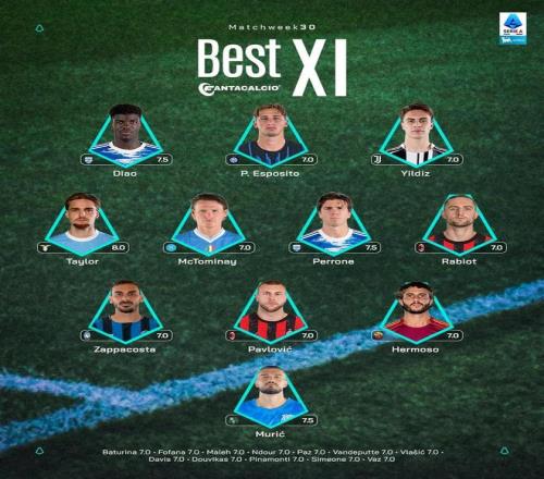 意甲第30輪最佳陣:皮奧、伊爾迪茲、麥克托米奈、拉比奧入選