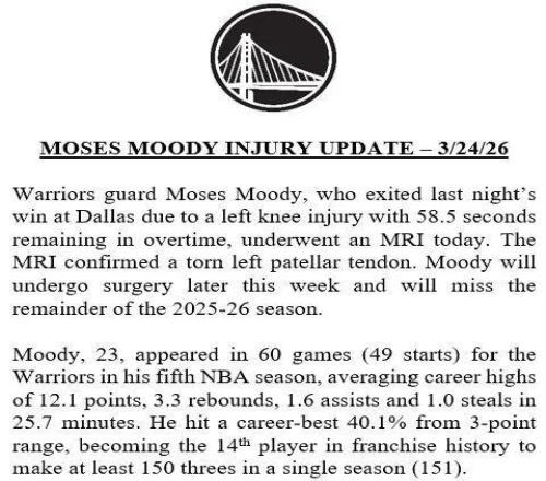 勇士是本賽季慘遭傷病潮困擾最嚴(yán)重的隊伍之一,且多是主力球員重傷,穆迪之前還有巴特勒右膝前十字韌帶撕裂、庫里由于右膝髕股關(guān)節(jié)疼痛綜合征(跑步膝)已連續(xù)休戰(zhàn)22場比賽,以及霍福德因為比目魚肌拉傷連續(xù)缺席6場歸期待定等等。