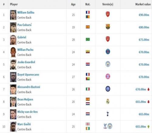 最新全球中后衛(wèi)身價排名(單位:歐元)