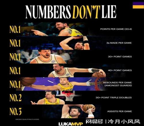 今日,湖人官方曬出了球隊后衛(wèi)盧卡東契奇本賽季的幾項數(shù)據,為其爭奪mvp造勢。結果顯示東契奇本賽季場均得分(33.4分)、場均三分命中數(shù)(4記)、單場30+次數(shù)(41次)、單場40+次數(shù)(13次)均排在聯(lián)盟第一;場均籃板球數(shù)7.9個,領跑聯(lián)盟所有后衛(wèi);30+三雙次數(shù)(7次)排在聯(lián)盟第二,場均助攻8.4次排在聯(lián)盟第三。本賽季至今,東契奇出戰(zhàn)60場常規(guī)賽,場均上場35.9分鐘得到33.4分7.9籃板8.4助攻1.6搶斷0.6蓋帽,三項命中率為47.4%、36.4%和77.2%。